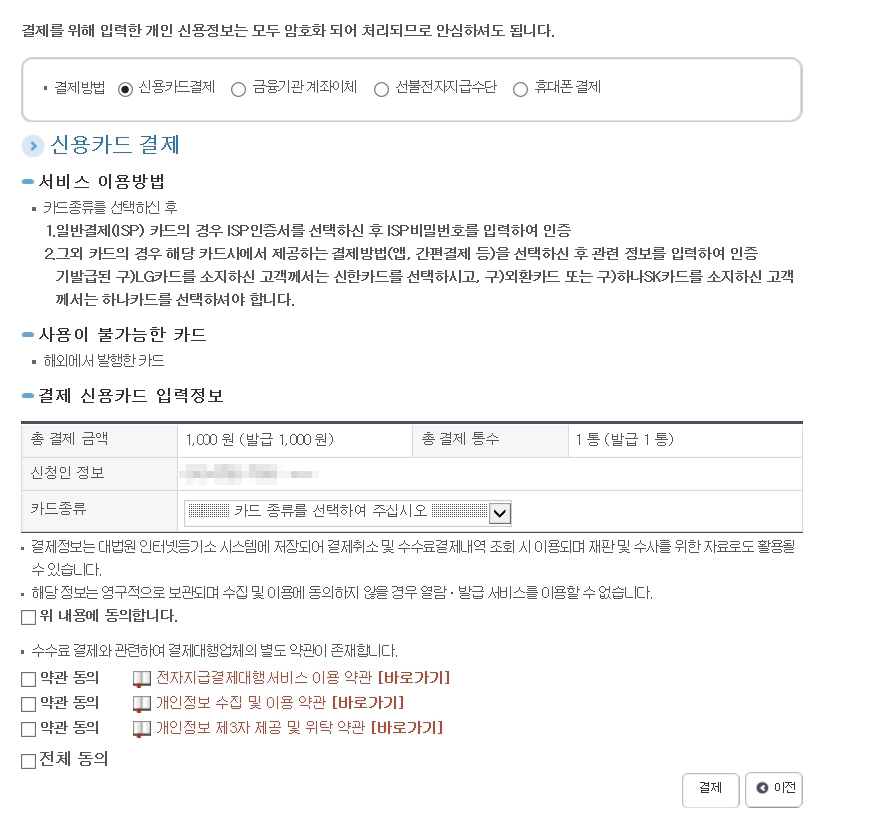 ■ 신용카드결제, 금융기관 계좌이체, 선불전자지급수단, 휴대폰결제 중 편하신걸로 결제하시면 모든 발급 절차가 끝납니다.