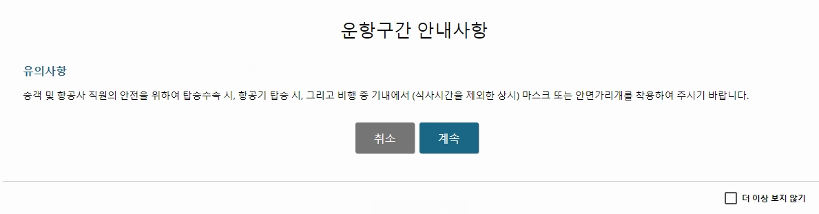■ 유의사항 팝업창이 뜨는데요, 승객 및 항공사 직원의 안전을 위하여 식사 시를 제외하고 마스크를 착용해야 한다고 합니다. 코로나19 바이러스의 예방을 위해 필히 마스크를 챙겨야 겠습니다.