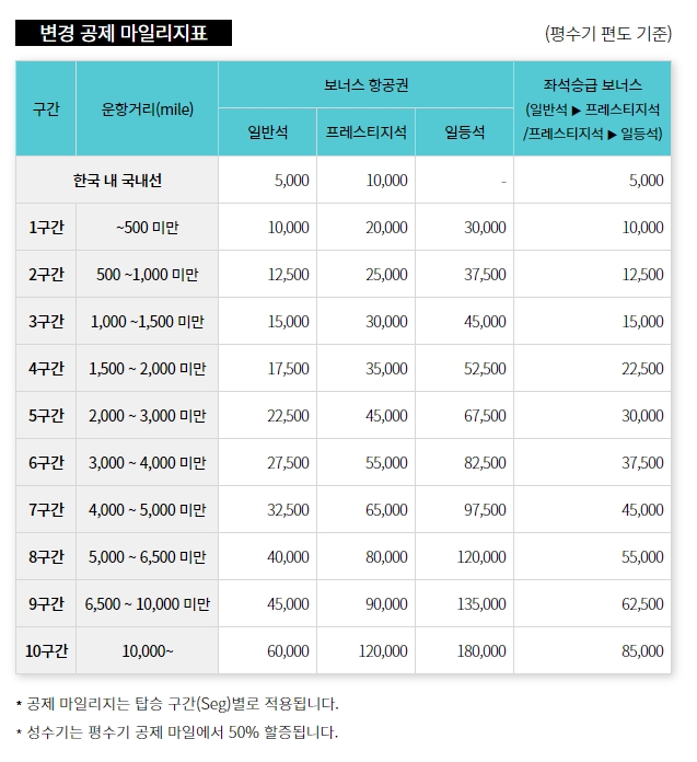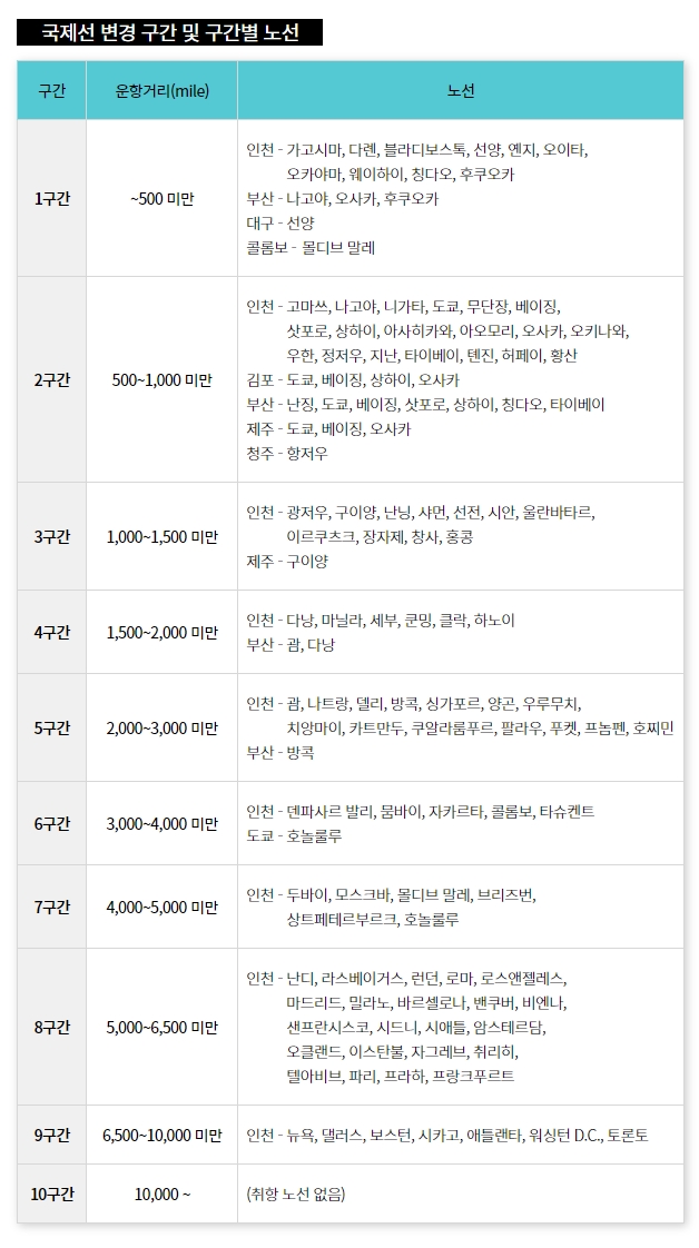 - 공제기준이 2021년 4월 1일부터 변경됩니다. 예전에는 지역(동남아, 미주, 유럽 등)으로 나뉘었던 공제 기준이 거리(마일)로 변경된다고 합니다. 아래 공지표에 보면 이용 노선의 실제 거리에 따라 공제 수준이 결정됨으로써 합리적인 기준으로 변경된다고 하는데 소비자 입장인 제 개인적인 입장에서는 사실 기존 방식이 더 합리적이라고 생각됩니다.