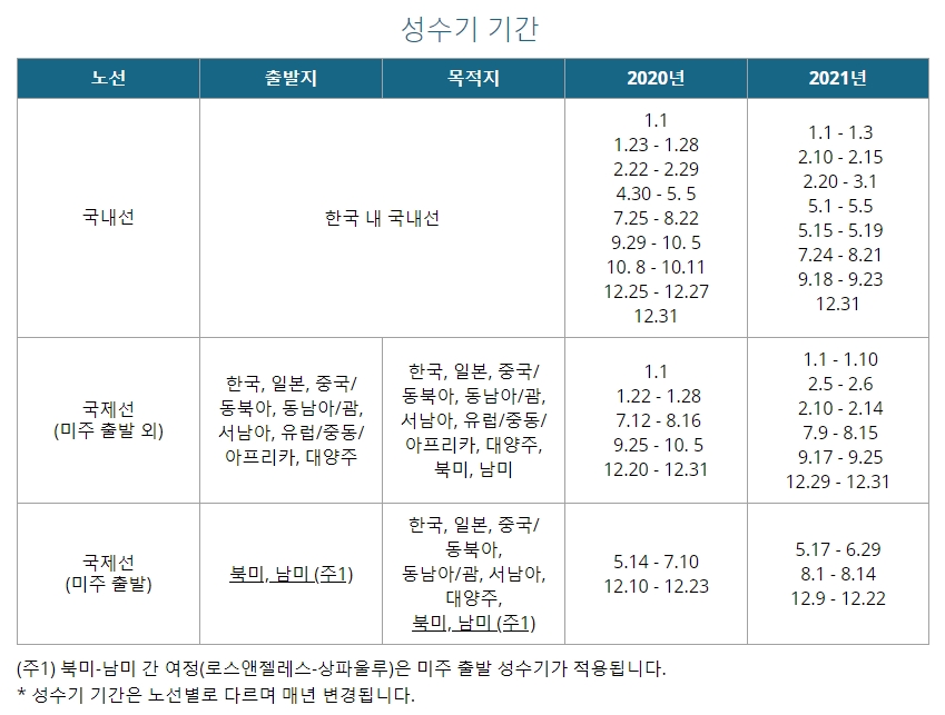 - 대륙별, 연도별 성수기 기간이 다르니, 마일리지로 항공권 발권하실 때 꼭 참고하세요.