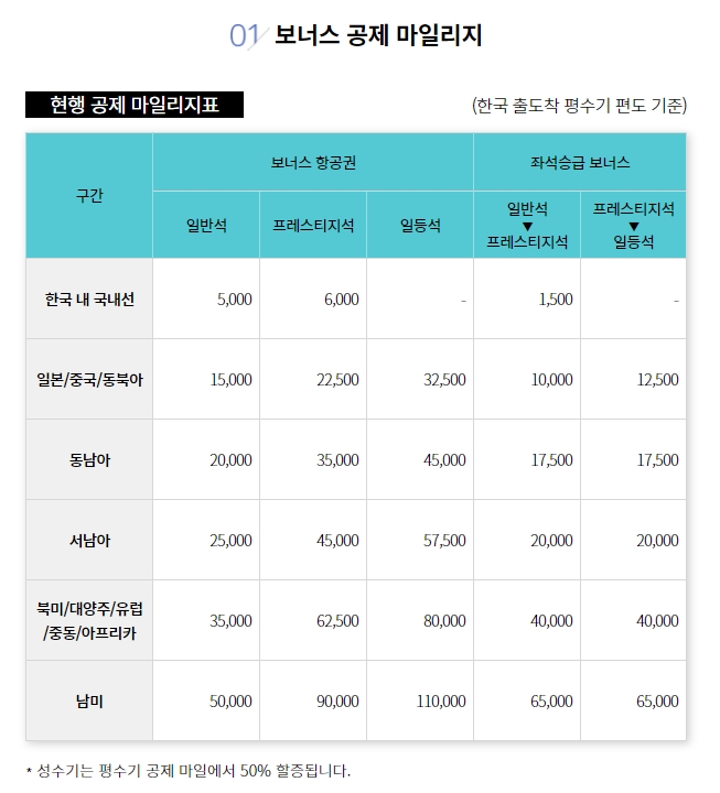 ■ 현행 공제 마일리지표는 위에서도 언급했듯이 대륙별로 마일리지가 공제 됩니다. 성수기 기간은 아래 공제 마일리지 표에서 50% 인상되며, 아래 마일리지 공제표는 편도 기준입니다. 예를 들어, 제주도를 마일리지로 발권하면 왕복 1만 마일리지이며, 성수기에는 1만5천 마일리지가 듭니다.