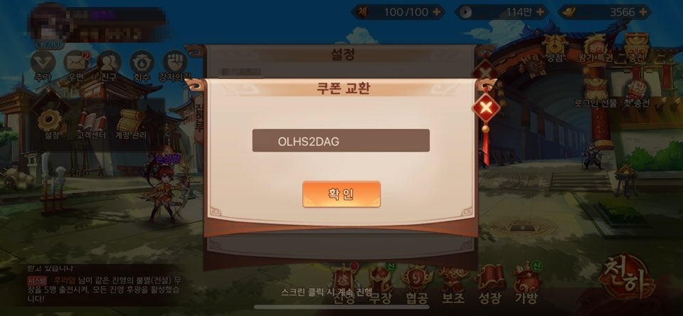 ■ 배경음과 효과음 설정과 쿠폰을 입력할 수 있는 교환 버튼이 보이는데요. 터치해주시면 됩니다.