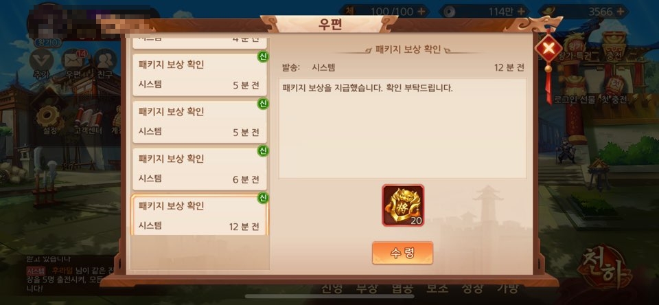 쿠폰번호를 모두 입력하면 우편함에 총 14개의 패키지 보상 확인 우편을 확인할 수 있습니다.