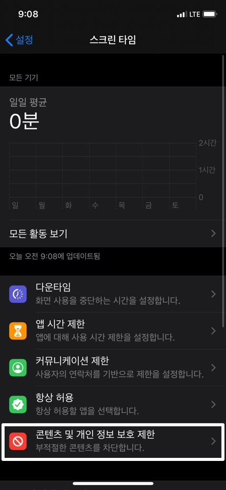 스크린 타임이 활성화가 안되어 있으신분들은 활성화를 해주시고 아래쪽에 콘텐츠 및 개인 정보 보호 제한을 터치해서 들어가주시면 됩니다.