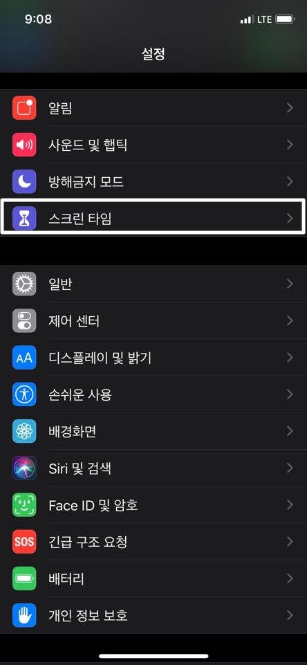 ■ 아래쪽으로 내려가시면 스크린타임을 터치해서 들어가주세요.