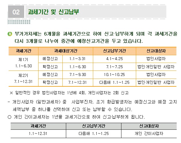 부가세 신고기간은 제1기 확정이므로 7월1일부터 7월25일까지이며, 과세기간은 1월1일부터 6월30일까지 입니다. 그리고 제2기 신고는 다음해 1월 1일부터 1월 25일까지가 신고기간이며, 과세기간은 7월1일부터 12월 31일까지 입니다. 개인사업자 중 일반과세자는 신고 및 납부를 완료하여야 합니다.