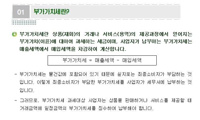 거래단계별로 재화나 용역에 생성되는 부가가치(마진)에 부과되는 조세로, 간접세의 일종입니다. 우리나라는 현재 재화 및 용역의 최종가격에 10%의 부가가치세가 포함됩니다. 부가가치세는 원칙적으로 모든 재화(상품)나 용역(서비스)의 공급에 대하여 과세되나, 예외적으로 저소득층의 세금부담 경감 또는 기타 조세정책적 목적으로 기초생활필수품 등 일부 재화와 용역의 공급에 대하여는 부가가치세를 면제하고 있습니다.