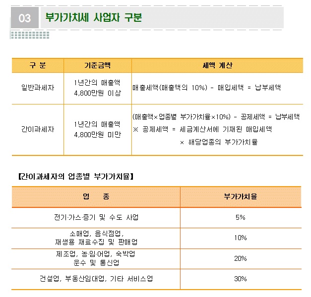과세대상자는 일반과세자와 간이과세자 이렇게 둘로 나뉩니다. 본인 사업의 유형은 어느 형태가 적절한지 확인해보고 사업자 등록을 하는 것이 중요합니다. 연간 매출액이 4,800만원 이상이거나 간이과세가 배제되는 업종이나 지역에서 사업을 하는 경우 일반과세자로 하는것이 좋습니다. 주로 소비자를 상대하는 업종이거나 연간 매출액이 4,800만원이 미달되거나 예상되는 소규모 사업자는 간이과세자로 하는것이 좋습니다.