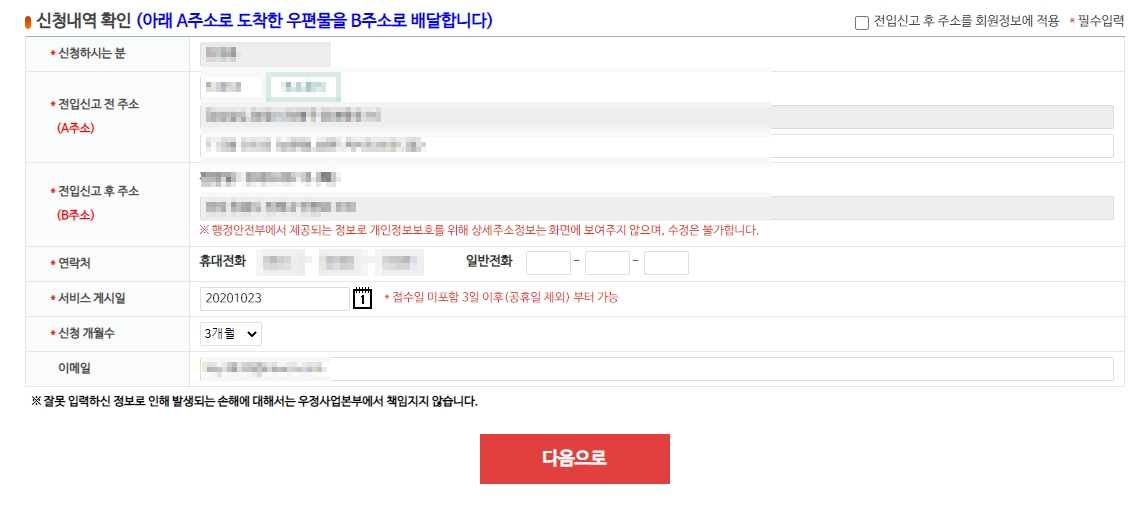 아직 전입신고 전이라면 새로운 주소와 서비스 개시일, 신청개월 수를 입력하시면 됩니다.