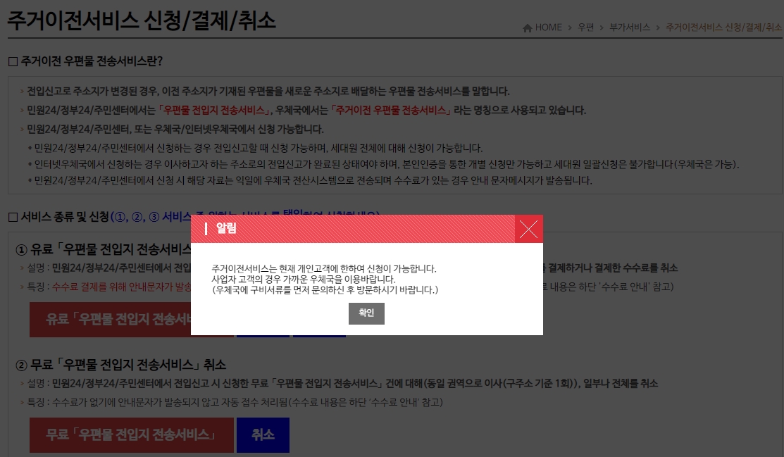 위에서 이미 나온 내용이지만 인터넷 우체국에서는 현재 개인고객에 한하여 서비스 신청이 가능하고