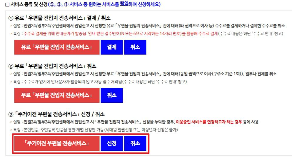 전입, 전출 등으로 주소가 변경된 경우에 새로운 주소지에서 우편물을 받고자 할 때
