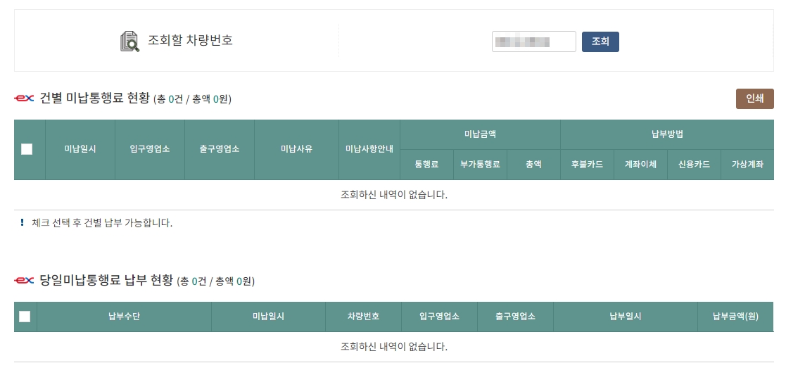 하지만 미납 내역이 있을 경우, 미납 일시 차량번호 영업소 등의 정보가 나오게 됩니다.