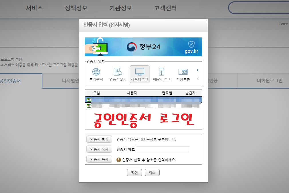공인인증서로 로그인하셔야 서비스를 이용할 수 있습니다.