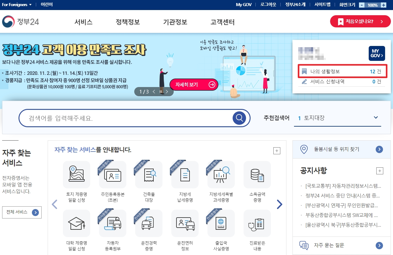 로그인하게 되면 우측 빨간 네모칸으로 표시해둔 나의 생활정보를 클릭하시면 됩니다.