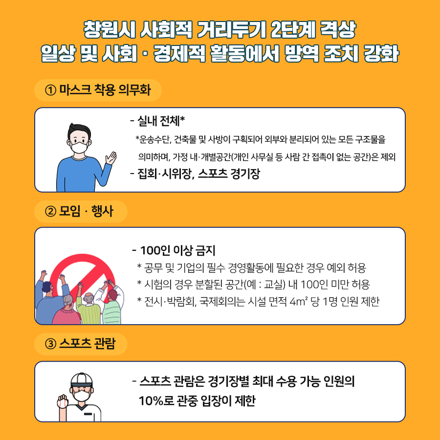 허성무 창원시장은 27일 신종 코로나바이러스 감염증(코로나 19) 대응 브리핑을 열어 "코로나 19 확산을 종식 시키고자 선제적 대응 조치로 29일부터 창원시 전역에 대해 사회적 거리두기를 2단계로 격상시킨다"라고 밝혔습니다.