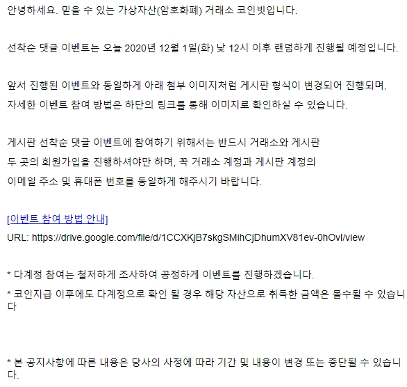 코인빗에서는 12월 1일 (화) 낮 12시 이후 랜덤하게 진행될 예정이라고 공지했습니다.