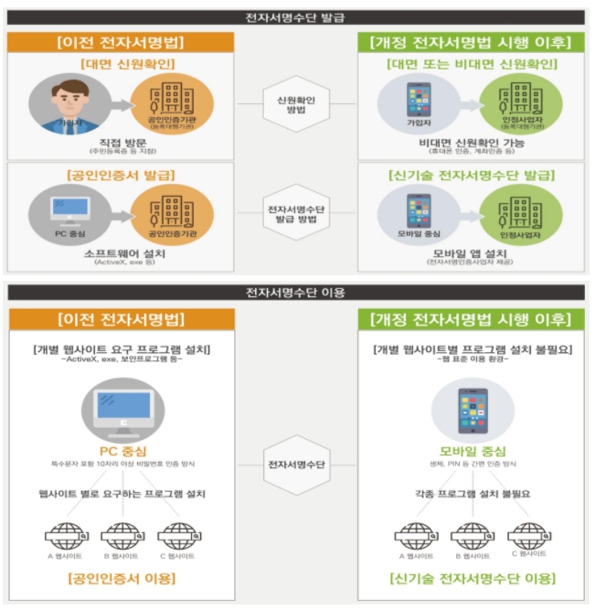 기존 공인인증서 발급하려면 은행에 대면하여 신원확인을 했지만, 개정된 전자서명법 시행 이후는 PC나 스마트폰으로 계좌인증 등을 통해서 가능한 비대면 신원확인도 가능하게 변경됩니다.
