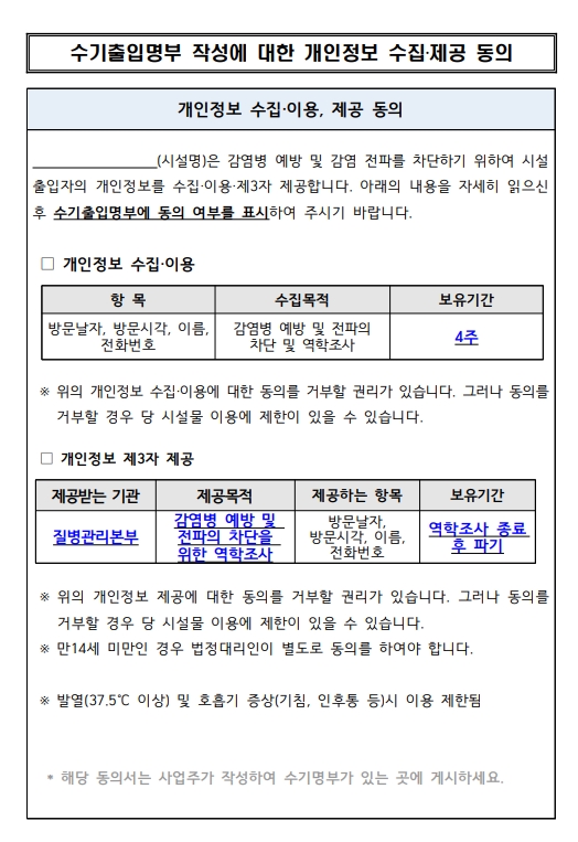 개인정보 수집 이용 동의에 대한 내용인데, 출입자 명부와 같이 게시해야 합니다.