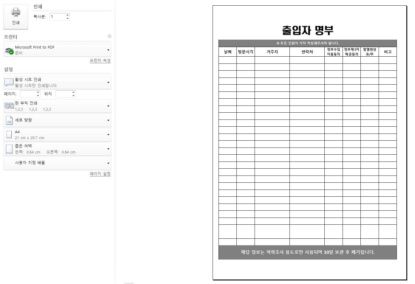아래 엑셀 파일 및 PDF 파일로 제작한 코로나 출입명부 양식입니다.