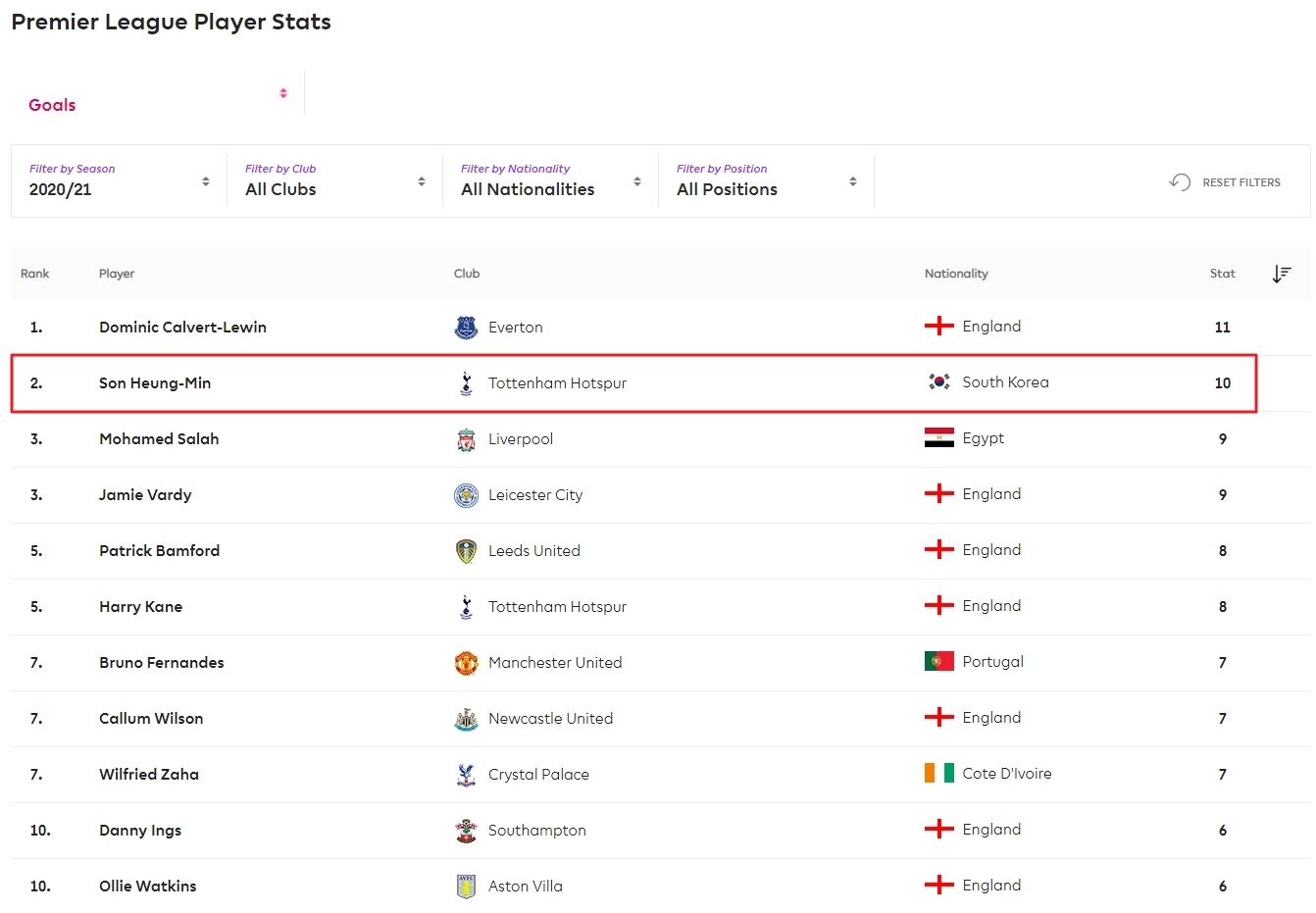 현재 손흥민 선수는 10골로 에버튼의 도미닉 칼버트 르윈 선수에 이어 리그 득점 순위 2위로 랭크 중입니다.