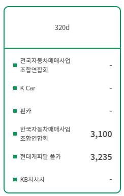 저는 3시리즈 모델의 디젤엔진인 320d를 검색해봤는데요, 클릭하면 바로 시세가 나옵니다. 6개의 업체 중 한국 자동차 매매사업 조합연합회에 현대캐피털 플카에서만 시세정보가 나옵니다. 다른 사이트는 위 주의사항에서도 나와있듯이 거래가 없어 중고거래 가격이 확인되지 않고 있습니다.