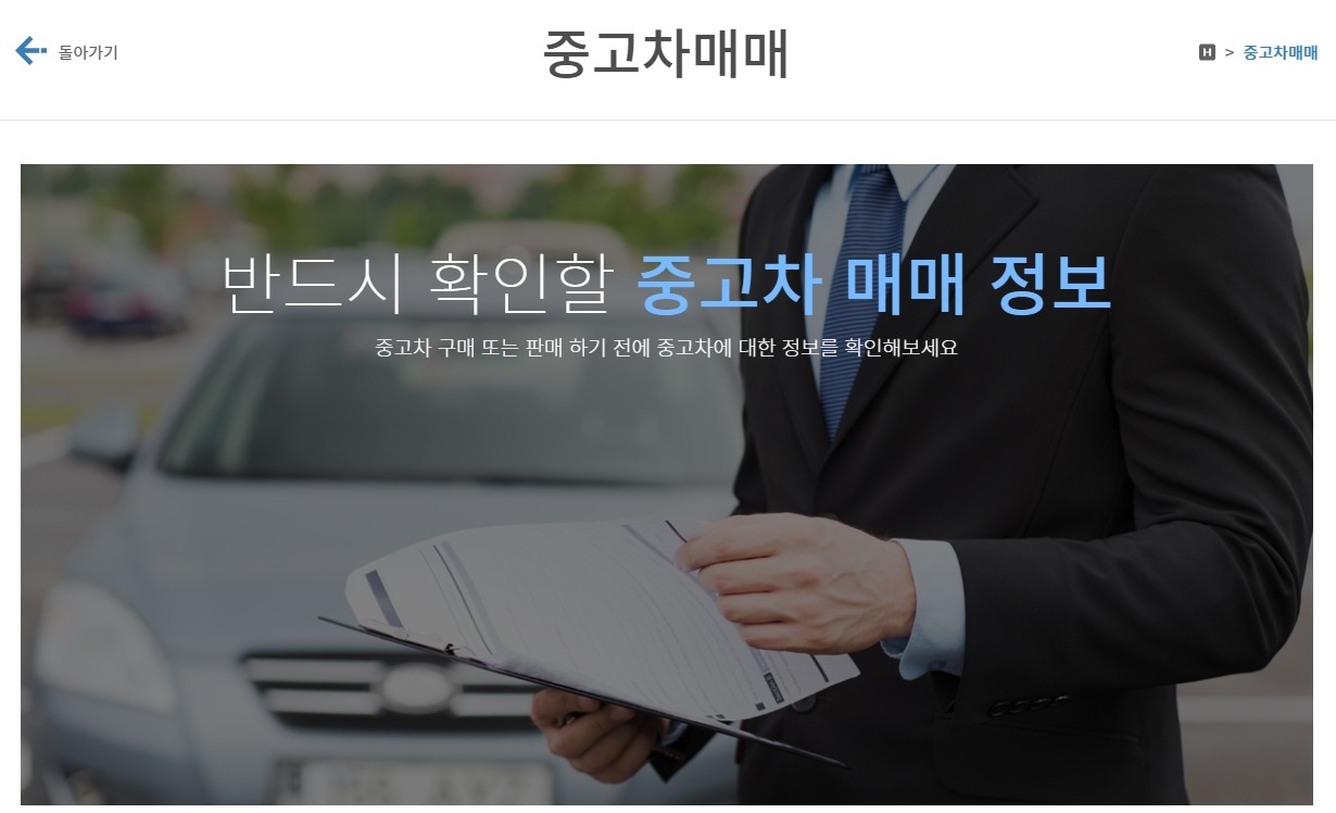 접속하시면 아래와 같은 화면이 나오는데요, 화면 중앙부분에 있는 중고차 매매 버튼을 클릭합니다.
