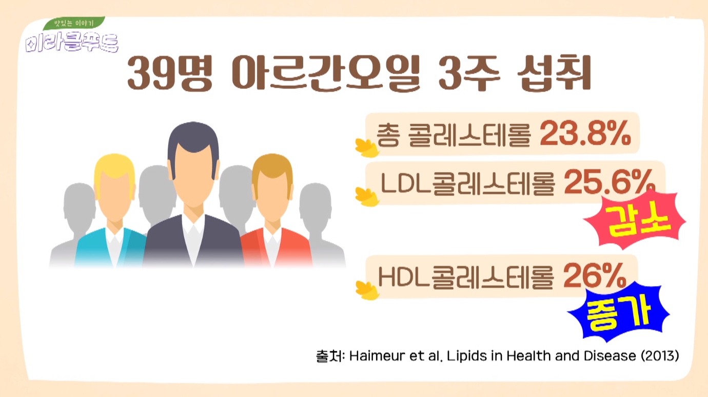 아르간오일은 콜레스테롤 수치를 낮추는데 도움을 줄 수 있는데 성인 39명을 대상으로 3주간 아르간 오일을 섭취한 결과 나쁜 콜레스테롤인 LDL 콜레스테롤은 25% 감소했고, 좋은 콜레스테롤인 HDL 콜레스테롤은 26% 증가했다는 연구 결과입니다.