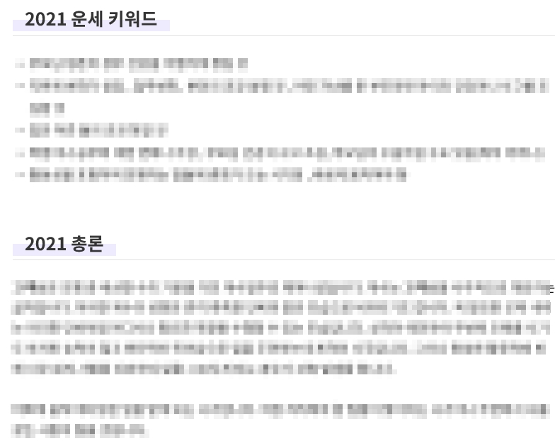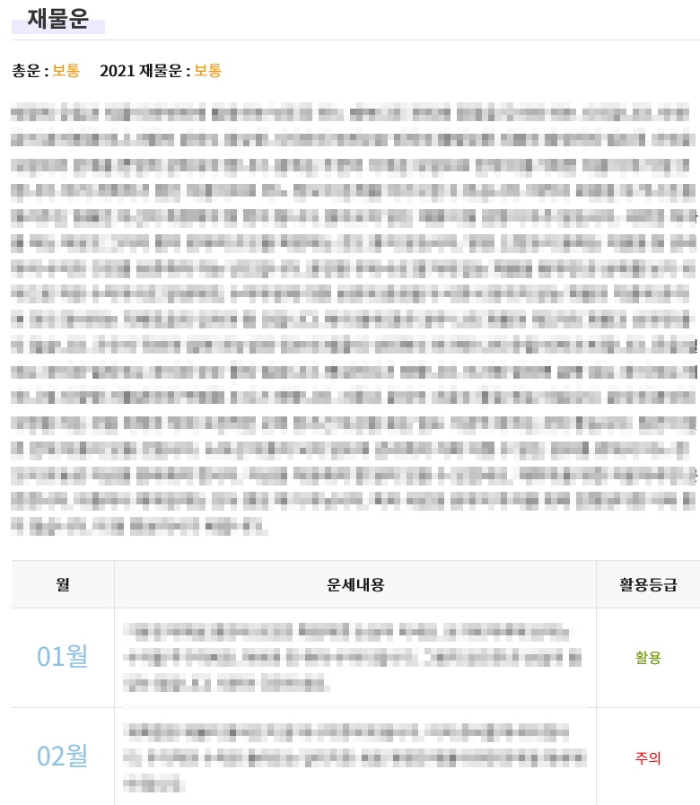 나의 사주 정보가 먼저 나오며 그다음으로는 2021 운세 키워드가 나옵니다. 그 다음은 2021 총론이 나오며, 총론 다음으로는 모두가 관심을 가질 재물운과 월별 재물운이 나옵니다. 그 다음으로 직장/사업운, 승진/시험/관운, 이성관계 순으로 나오며 마지막으로는 행운지수 및 운세 활용 조언이 나옵니다. 무료라고 해서 단순하게 나오는 것이 아니라, 각 운 별로 자세하게 풀어주니 정독하다 보면 시간 가는 줄 모르게 보실 수 있으실 겁니다.