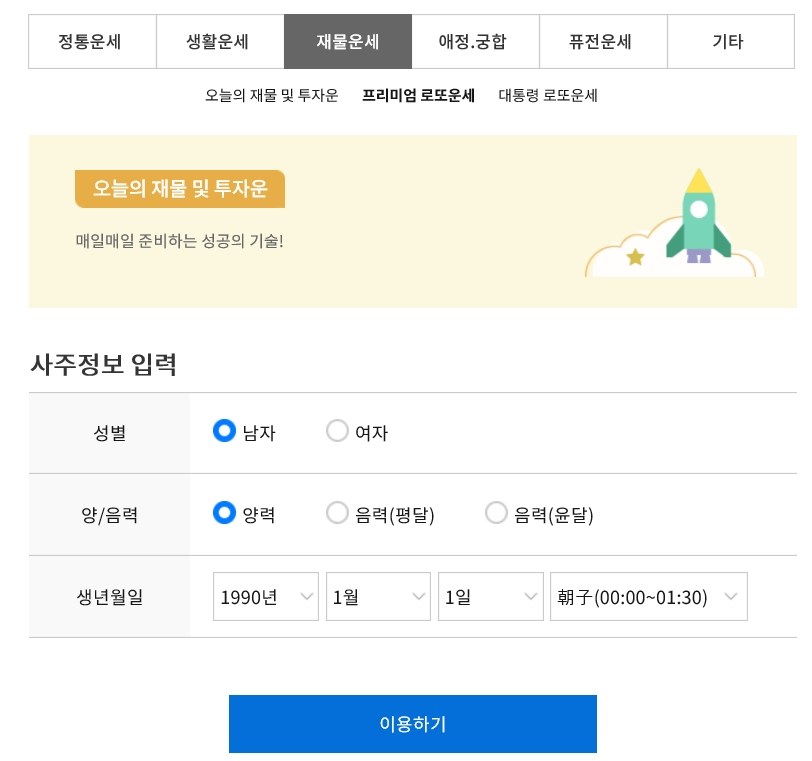 많은 분들이 운세를 볼 때 가장 중요하게 여기는 한 가지는 바로 재물 즉 돈에 관련된 내용일 것입니다. 농협 무료 운세 바로가기 에는 오늘의 재물 및 투자운에 대해서도 확인할 수 있습니다. 성별과 양/음력을 선택한 후 생년월일과 태어난 시를 입력하고 이용하기 버튼을 누르면 오늘의 재물 및 투자운에 대해서 확인하실 수 있습니다.