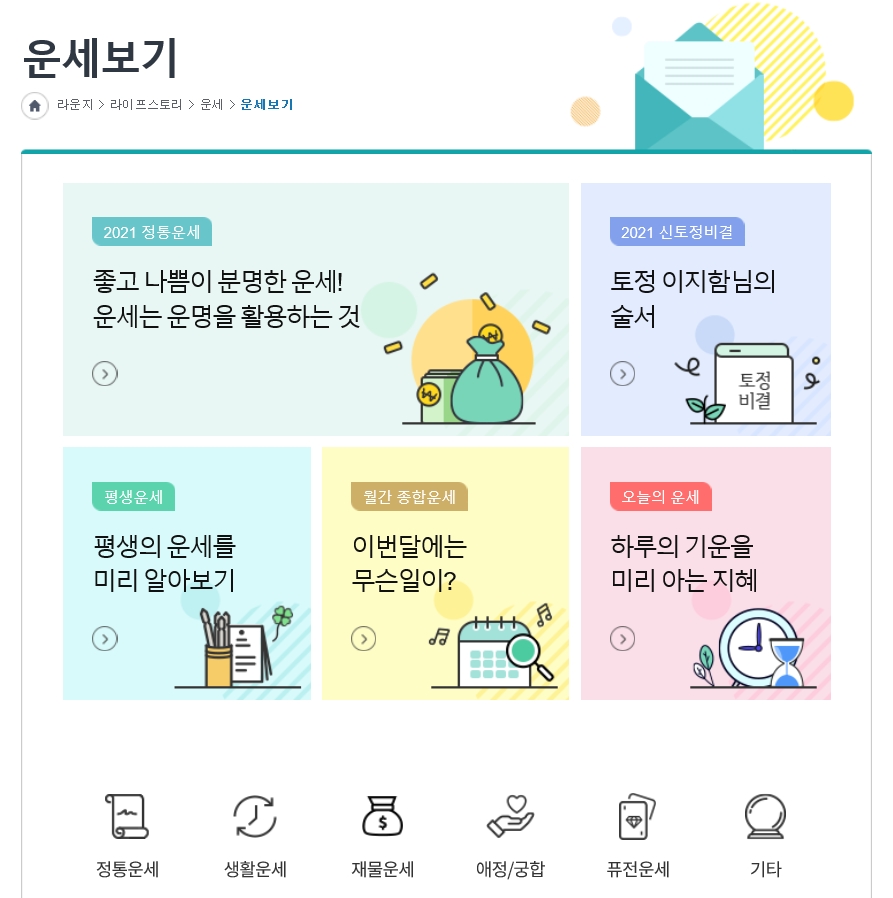 이번에는 토정비결을 통해 다가오는 신년에 대한 재물운, 직장사업운, 가정 및 건강운과 이성 및 대인관 계운 그리고 월별 운세를 볼 수 있는 2021 신토정비결 메뉴를 이용하여 다가오는 신축년에 대한 신년운세를 무료로 확인해 볼 수 있습니다.