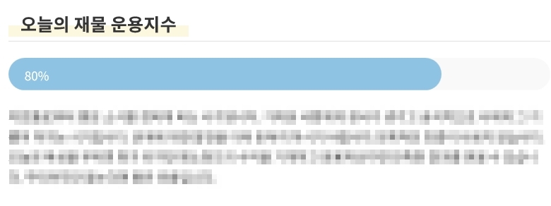 역시 사주 정보가 나오며 오늘의 재물 및 투자운 이라는 내용에 맞게 오늘의 재물 운용 지수가 나옵니다. 그리고 총론/성공 재물운/상한가 전략운/ 행운예감 업그레이드가 나오는데요. 행운예감 업그레이드에서는 행운의 색상과 행운의 숫자 그리고 행운의 방향 행운의 성씨에 대해서 나옵니다.