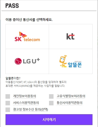 신청을 위해서는 먼저 가지고 계신 스마트폰으로 본인 인증을 하셔야 합니다. 본인이 이용하고 있는 통신사를 선택하시고 본인인증 절차를 진행합니다.