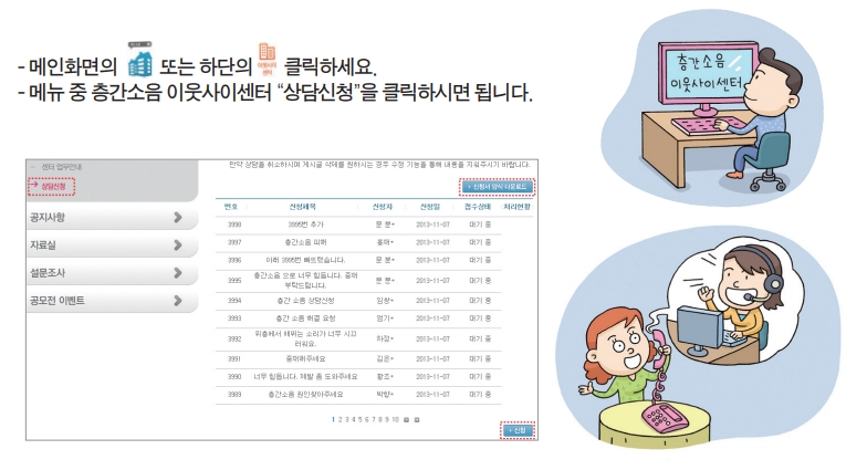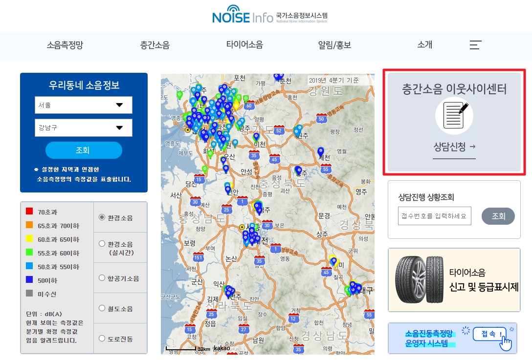 홈페이지에 접속하시면 우측에 배너로 층간소음 이웃사이센터 상담 신청을 클릭해서 접속해 줍니다.
