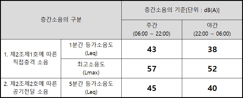 위 표의 기준에도 불구하고 「주택법」 제2조 제2호에 따른 공동주택으로서 「건축법」 제11조에 따라 건축허가를 받은 공동주택과 2005년 6월 30일 이전에 「주택법」 제16조에 따라 사업승인을 받은 공동주택의 직접충격 소음 기준에 대해서는 위 표 제1호에 따른 기준에 5dB(A)을 더한 값을 적용합니다.