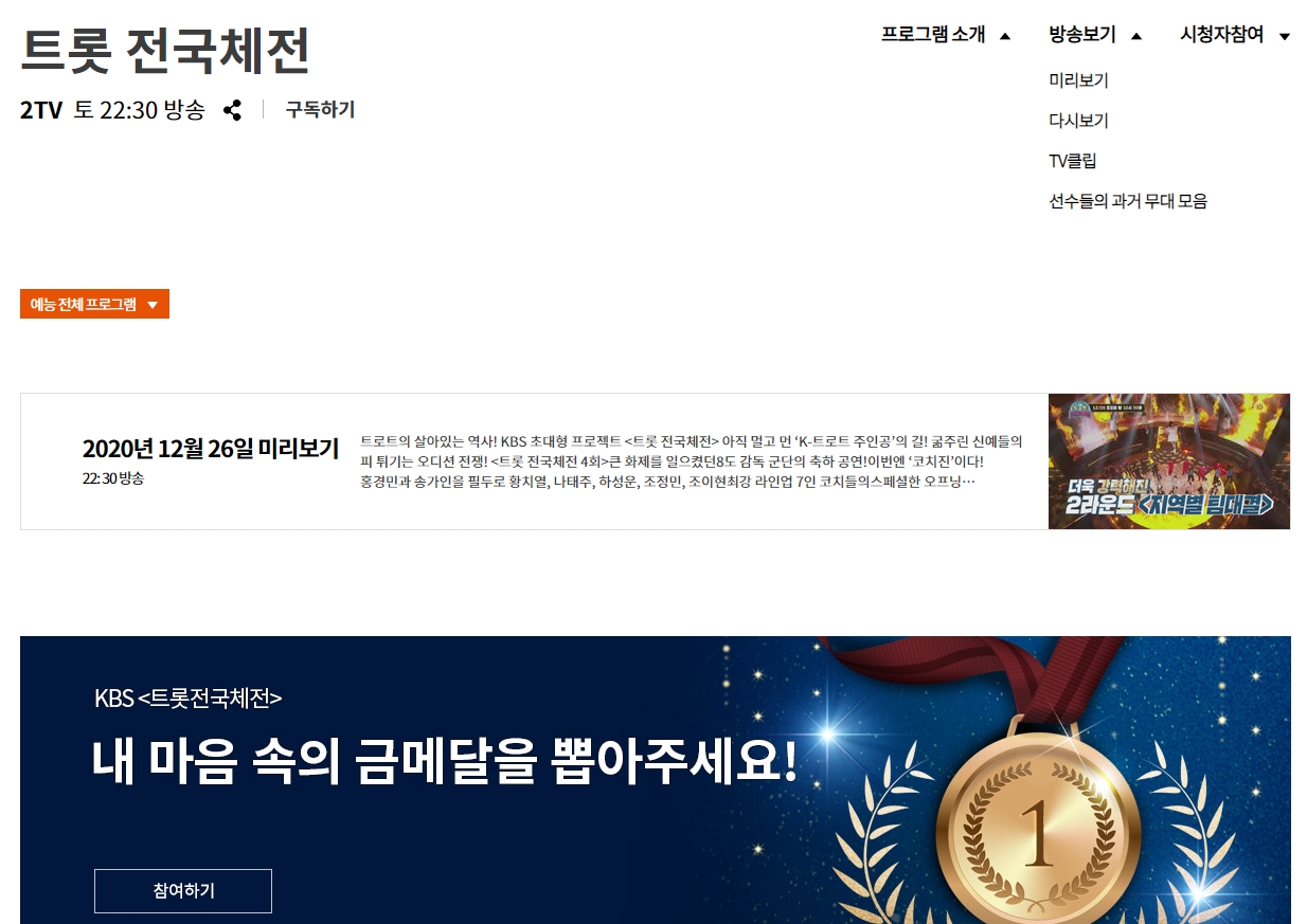 우연히 부모님께서 저번 주 방송한 트롯 전국체전 방송을 보고 싶다고 하셔서 방송 편성표를 찾아서 시간 맞춰 틀어드렸더니 정말 집중해서 재미있게 잘 보시더라고요. 오늘은 제가 찾아본 KBS2 트롯 전국체전 재방송 다시보기 방송편성표 재방송시간 온에어 실시간 방송 보기에 대해서 알아보도록 하겠습니다.