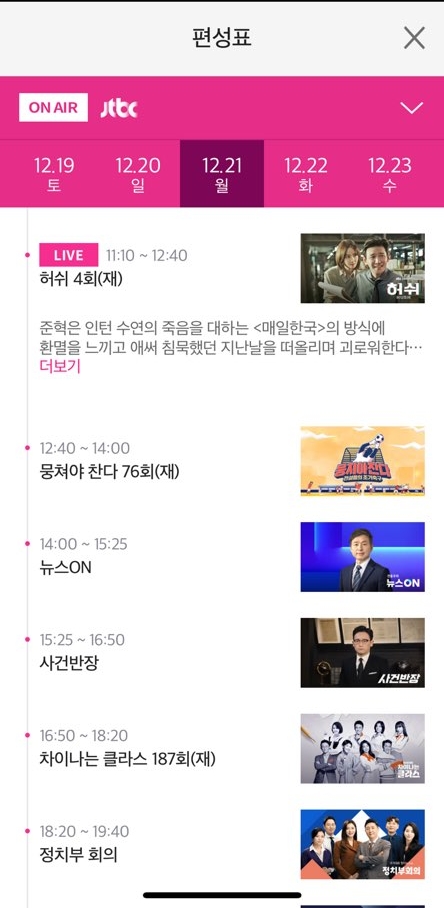 이상으로 JTBC 1호가 될 순 없어 다시보기 JTBC 1호가될순없어 재방송 다시보기 방송편성표 방송시간 온에어 바로가기에 대해서 알아보았습니다. 좋아하는 프로그램 본방사수를 못했을 경우에 다시 보고 싶었는데, 제가 알아본 방법을 여러분들께 공유하고자 포스팅했습니다. 많은 도움이 되었으면 좋겠네요. 추운 겨울 따뜻하게 보내시고, 코로나 19 바이러스로 힘든 이 시국이지만 다들 힘내시길 바라겠습니다.