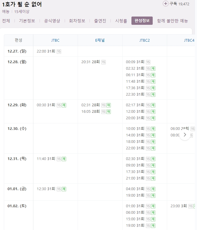 검색하시면 우측의 편성정보를 클릭하시면 되는데요, JTBC, E채널, JTBC2, JTBC4 채널에서 1호가 될 순 없어 재방송 시간대를 한눈에 쉽게 보실 수 있습니다.