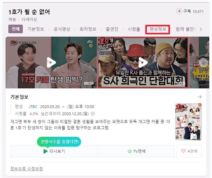 개그맨 부부의 결혼생활을 담은 JTBC 1호가 될 순 없어 를 우연히 1회를 보고 어느덧 매주 일요일마다 본방 사수하는 프로그램입니다. 저번 주 방송을 못 봐서 이번에 JTBC 1호가될순없어 재방송 보는 방법을 찾아봤는데요, 오늘은 여러분들께 JTBC 1호가 될 순 없어 재방송 다시보기 방송편성표 재방송 시간 온에어 바로가기 에 대해서 알려드리려고 합니다.