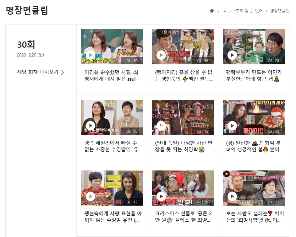 JTBC 1호가 될 순 없어 홈페이지에서 제공하는 명장면 다시보기는 지난 회차 방송분에 명장면이라고도 할 수 있는 장면들을 모았습니다. 저번 주 방송에서는 이경실 님이 최병서 님에게 대시받은 썰을 포함 해서 여러 가지 명자면들을 담고 있으니 간단히 보기 좋은 거 같습니다.