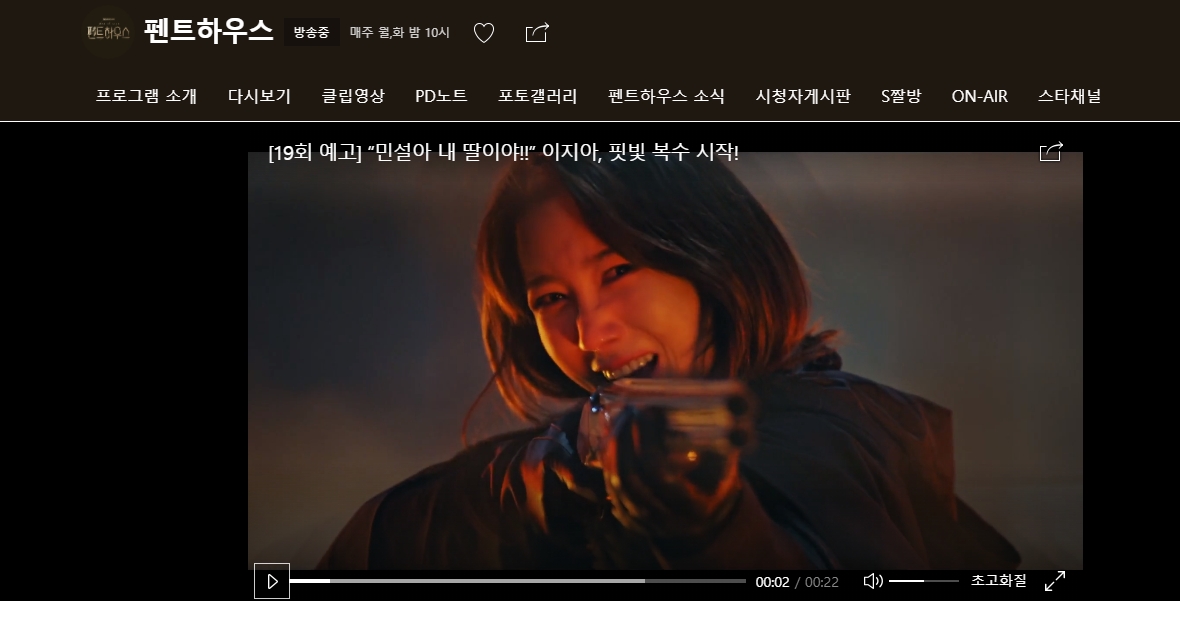 SBS 펜트하우스 홈페이지에 접속하게 되면 펜트하우스 19회 예고편이 나오며 프로그램 소개, 다시보기, 클립 영상 등을 제공하고 있습니다. 펜트하우스 19회 에서는 '민설아 내 딸이야!!' 이지아, 핏빛 복수 시작이라는 제목으로 짤막한 예고편 영상이 나오네요.