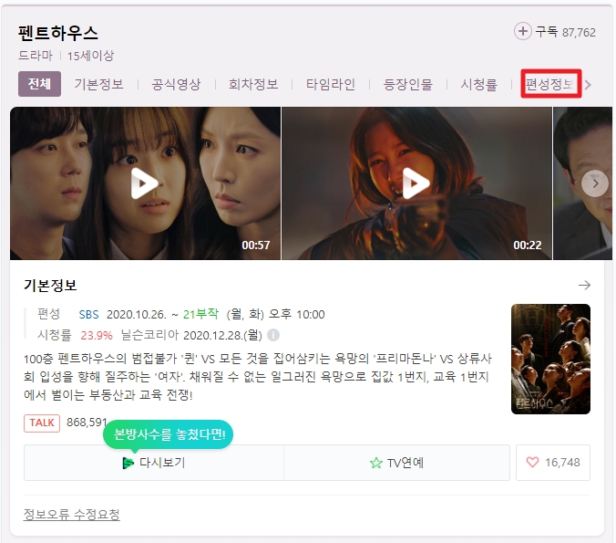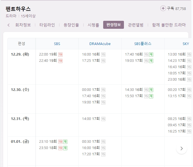 네이버 같은 포털 검색창에 펜트하우스라고 검색하시면 드라마 펜트하우스 정보가 나오는데요. 상단에 편성정보를 클릭하시면 SBS, DRAMACUBE, SBS플러스, SKY, 드라마 H 채널에서 회차별 재방송 시간대를 확인할 수 있습니다. 역시 인기 있는 드라마라 그런지 많은 채널에서 펜트하우스 재방송 을 하고 있습니다.