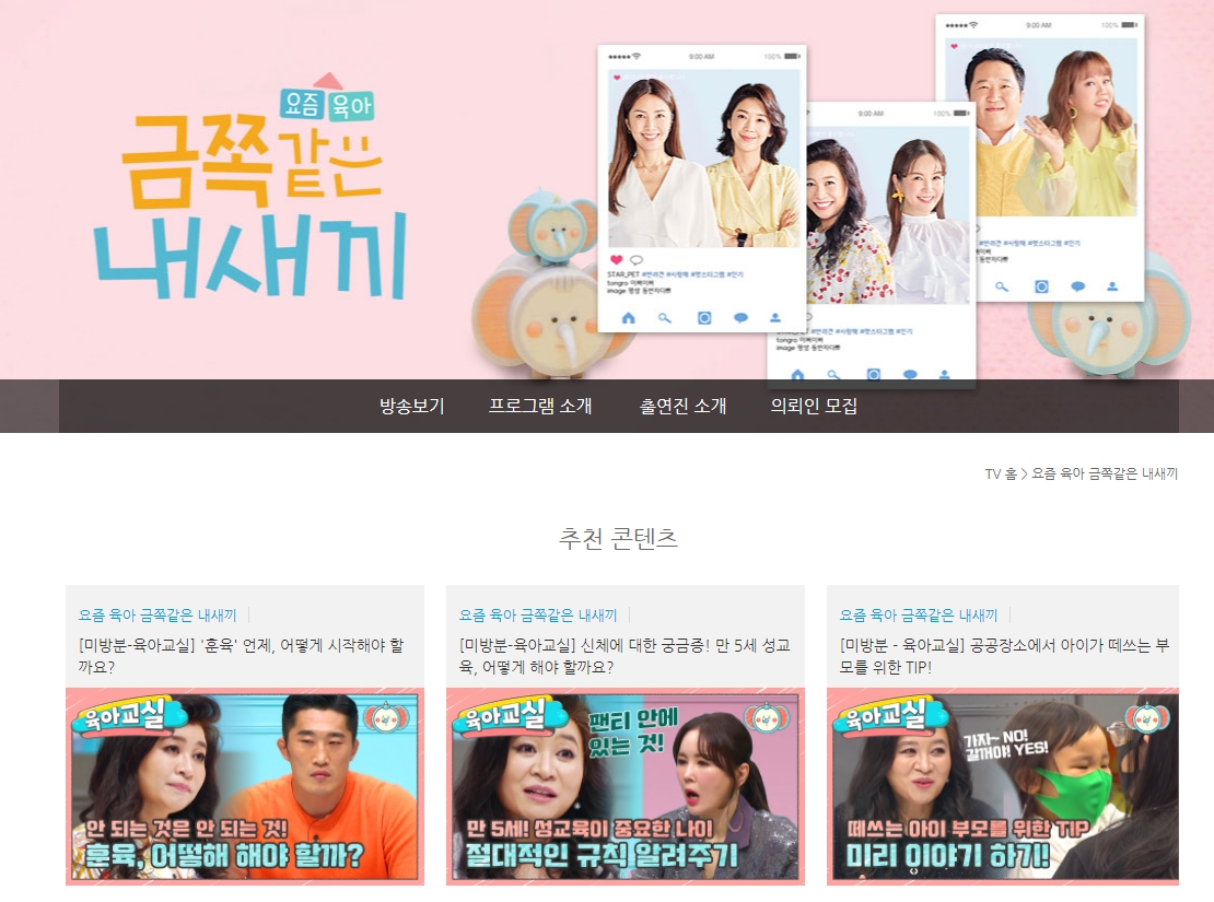 채널A 금쪽같은 내새끼 홈페이지에 접속하게 되면 방송보기 / 프로그램 소개 / 출연진 소개 / 의뢰인 모집 메뉴로 구성이 되어있고, 하단에는 추천 콘텐츠로 짧은 광고와 함께 방송에서 나왔던 미방분으로 육아교실 TIP을 보실 수 있습니다.