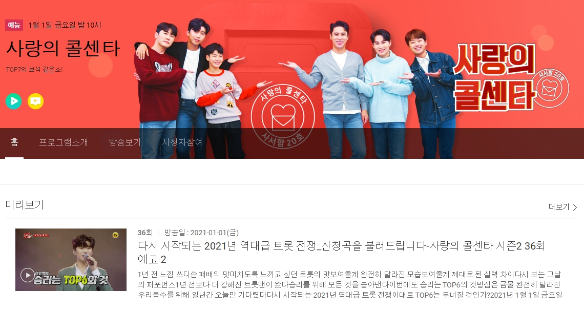 미스터트롯 이 끝나고 아쉬웠을 때 TV조선 에서는 미스터트롯 TOP7 으로 여러 예능 방송을 하였습니다. 그 중 하나인 사랑의 콜센터 인데요. 미스터트롯 TOP7 이 출연하여 시청자들의 신청곡을 불러주는 컨셉인 이 프로그램은 첫방송과 동시에 대박을 쳤습니다. 미스터트롯 출연진들은 어느 방송이든 나올때마다 히트를 치며, 시청률 보증수표로 자리잡았습니다. 내일이면 사랑의 콜센터 36회가 방송 됩니다. TV조선 사랑의 콜센터 재방송 다시보기 티비조선 편성표 방송편성표 재방송시간 에 대해서 알아보도록 하겠습니다.