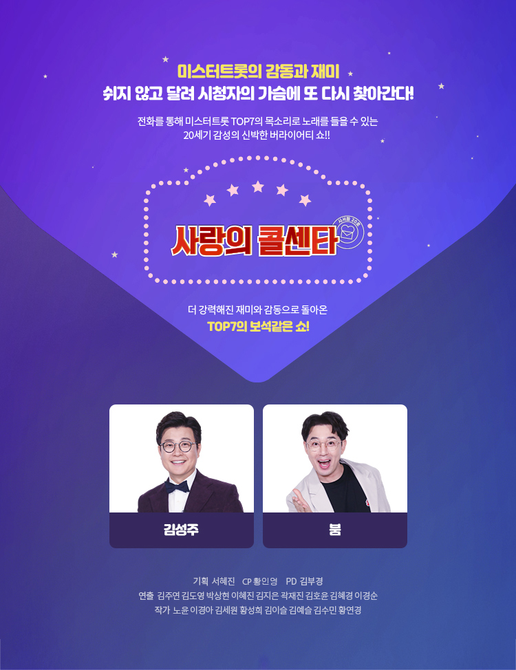 엄청난 인기를 얻은 미스터트롯 의 아쉬움을 달래고자 미스터트롯 TOP7 이 특정 시간 동안 전국 각지에서 걸려온 전화를 통해 신청자의 사연과 신청곡을 받은 후 그 자리에서 즉석으로 신청곡을 불러 주는 실시간 전화 노래방 형식의 프로그램 입니다. 현재는 김호중 가수님이 빠진 TOP6 분들만 출연 중입니다.