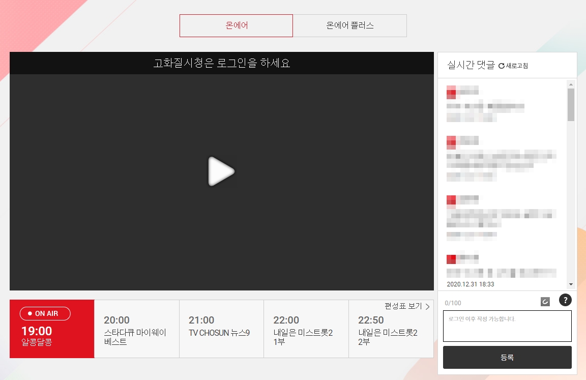 만약 아이들 키우느라 집에 TV가 없으신 분들이나, 목요일 10신데 밖에 대중교통으로 이동 중이신 분들도 생방송을 챙겨보실 수 있습니다. 바로 TV조선에서 제공하고 있는 온에어 서비스를 이용하시면 됩니다.