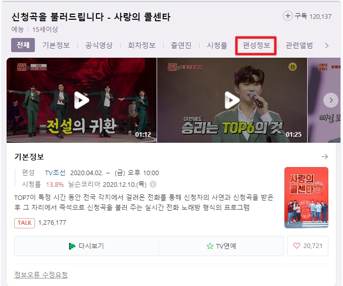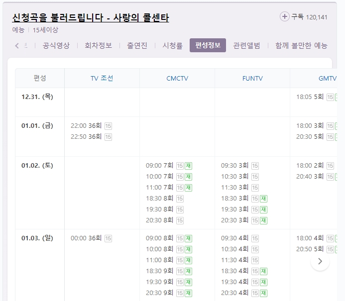 네이버에 사랑의 콜센터 라고 검색하시면 사랑의 콜센터 에 관한 정보가 나오는데요. 여기서 편성정보를 클릭하시면 티비조선 편성표 가 나오고 몇 회차 재방송 이 언제 하는지 나와있습니다.