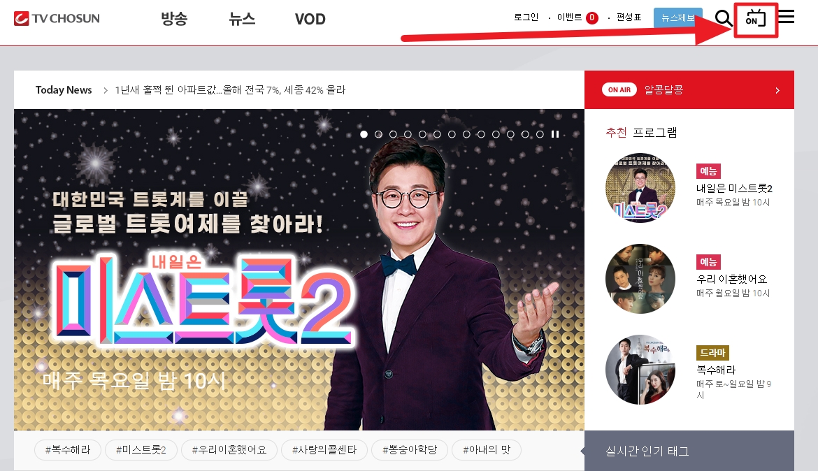TV조선 홈페이지에서 우측 상단에 ON 이라고 적혀있는 아이콘을 클릭하시면 되는데요. 별도의 프로그램 설치 없이 바로 볼 수 있습니다. 다만 고화질로 시청하시고 싶으시면 회원가입을 하셔서 로그인하셔야 합니다. 아무래도 좋아하는 가수의 얼 굴을 보려면 고화질로 시청하는 편이 좋겠죠?