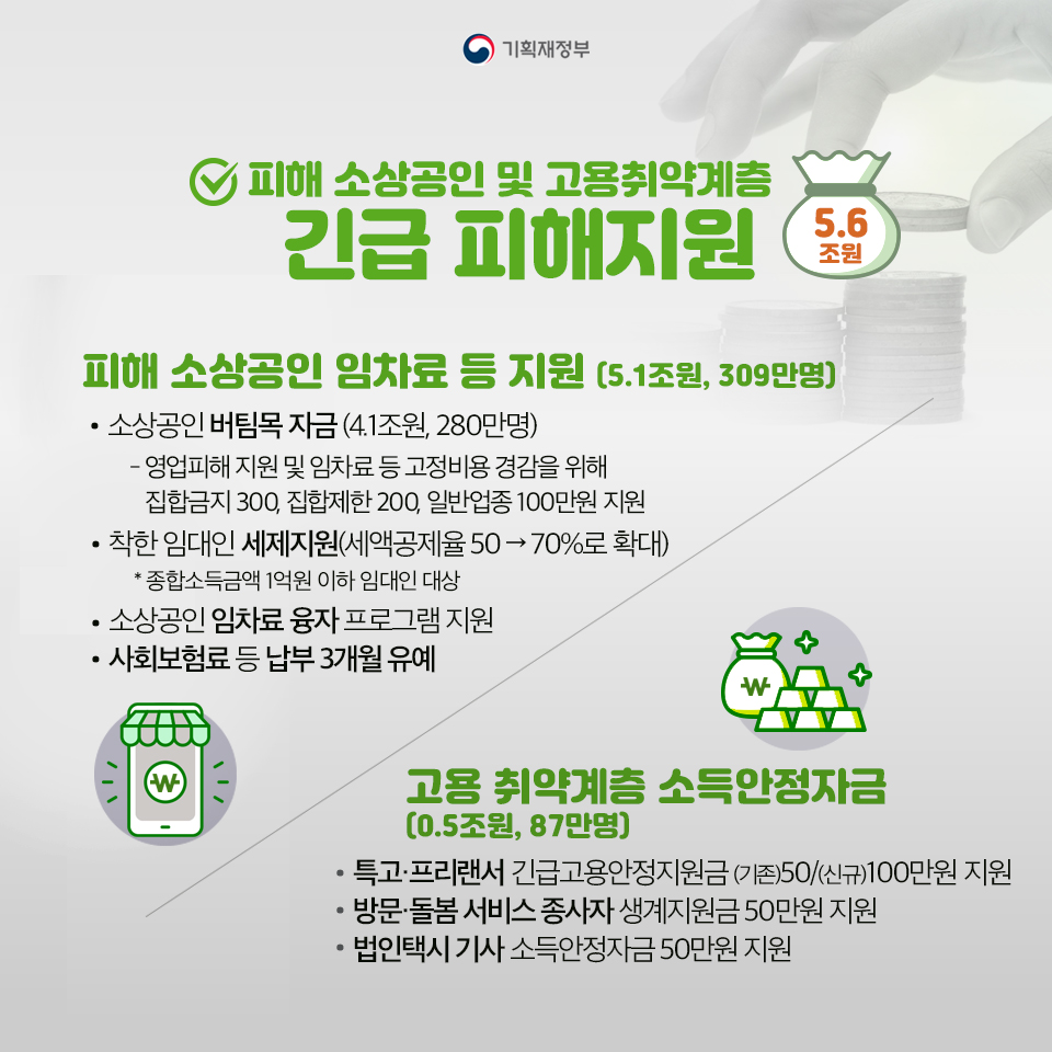 매출이 감소한 소상공인에게 150 ~ 300만원을 현금으로 지급하는 '소상공인을 위한 버팀목자금' 4조 1천억원이 편성되었다고 합니다. 정부가 시행한 방역조치로 인해 2019년 매출액이 4억원 이하이면서, 코로나 확산 후 2019년 매출보다 감소한 소상공인(직원수 제조업/건설업/운수업/광업 10인 미만, 그 외 5인 미만)을 대상으로 100만원이 지급될 예정입니다.