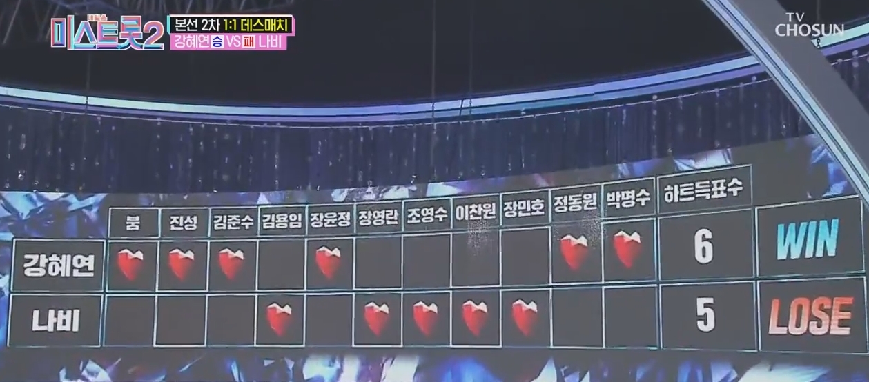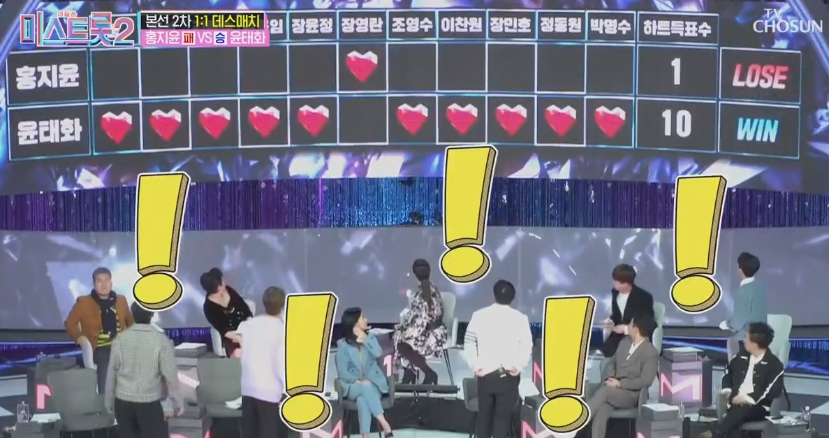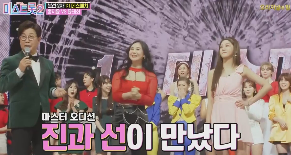 미스트롯2 5회 에서는 본선 2라운드 '일대일 데스매치' 에서 불꽃 튀는 치열한 경쟁을 보여줬습니다. 미스트롯2 에서 선공개한 어마어마한 대진인 진선대전인데요. 홍지윤 이 윤태화 를 지목해서 성사된 대결입니다. 이미 대진표를 본 마스터들은 사실상 결승전이라며 왜 이렇게 붙여놨냐며 모두의 이목을 집중시켰습니다.