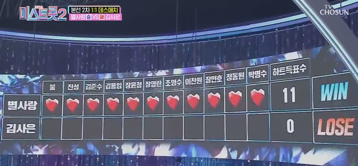 두 번째 데스매치는 별사랑 과 김사은 입니다. 별사랑은 '이수진 - 한방에 훅' 이라는 곡을 선곡했는데, 마지막 연습 날 발목 부상을 당했음에도 불구하고 리듬체조 댄스를 선보이며 마스터들을 놀라게 했습니다. 김사은은 '혜은이 - 진짜 진짜 좋아해(심수봉 ver.)' 을 선곡하며 남편 슈퍼주니어 성민의 지원을 받았지만 심사위원은 만장일치로 별사랑에게 손을 들어주었습니다.